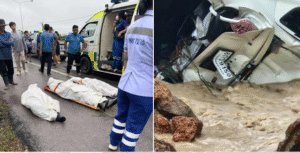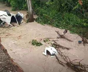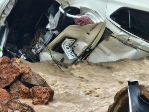 สลดเก๋งวิ่งผ่าสายฝนเสียหลักชนเสาไฟรถจมน้ำดับ 3 ราย
