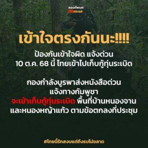 เมื่อวันที่ 9 ตุลาคม 2568 เพจเฟซบุ๊ก กองทัพบก ทันกระเเส รายงานความเคลื่อนไหวของกองกำลังบูรพา โดยระบุว่า เข้าใจตรงกันนะ ป้องกันเข้าใจผิด แจ้งด่วน 10 ต.ค. 68 นี้ ไทยเข้าไปเก็บกู้ทุ่นระเบิด กองกำลังบูรพาส่งหนังสือด่วน แจ้งทางกัมพูชา จะเข้าเก็บกู้ทุ่นระเบิด พื้นที่บ้านหนองจาน และหนองหญ้าแก้ว ตามข้อตกลงที่ประชุม