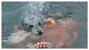 หนุ่มนักว่ายน้ำรีบเข้าไปช่วย หลังเห็นคล้ายลูกสุนัขกำลังจมน้ำกลางทะเล กลายเป็นคลิปช็อก… ความจริงคือแมวน้ำกำลังล่าเหยื่อ ปลาหมึกยักษ์อยู่ในปากมัน!