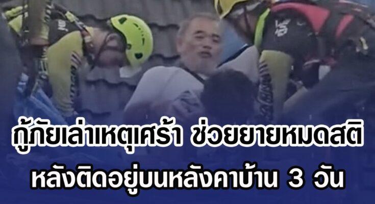 จากการสอบถามทราบว่า ทั้ง 2 คนติดอยู่บนหลังคามา 3 วันแล้ว ไม่ได้กินน้ำ อาหาร อาศัยเพียงใช้มือรองน้ำฝนกินประทังความหิว ส่วนยายป่วยเป็นโรคอัลไซเมอร์ ประกอบกับต้องนั่งตากแดดตากฝนและไม่ได้กินอาหารมา 3 วันแล้ว