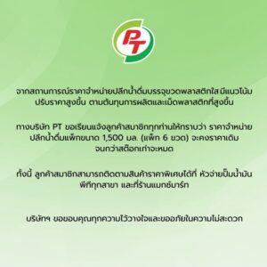 ทางบริษัท PT จึงขอแจ้งให้ลูกค้าสมาชิกทุกท่านรับทราบว่า ราคาจำหน่ายปลีกน้ำดื่มแพ็กขนาด 1,500 มิลลิลิตร (แพ็ก 6 ขวด) จะยังคงจำหน่ายในราคาเดิมไปก่อน จนกว่าสินค้าสต๊อกเดิมจะหมด